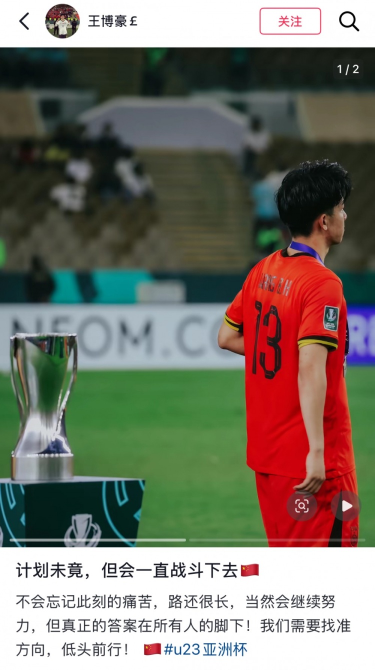 1月25日讯 U23亚洲杯决赛,U23国足0-4不敌日本U23,夺得赛事亚军。赛后替补出战的王博豪更新社媒,表达了对失利的遗憾。